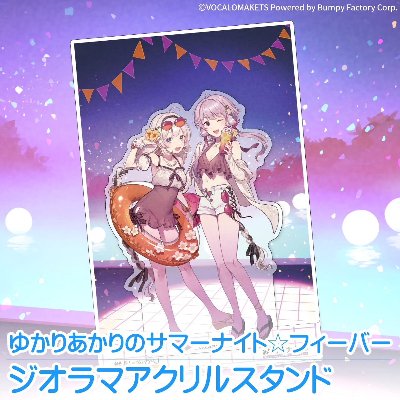 結月ゆかりと紲星あかりがふたりでナイトプールで遊ぶ姿をイメージしたジオラマアクリルスタンドです。
